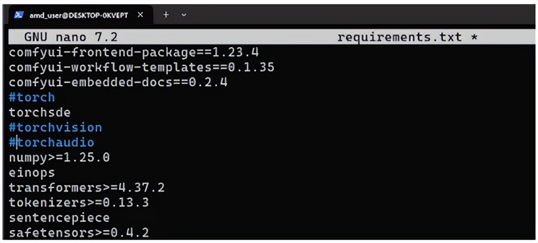 为避免与 ROCm 版本的 PyTorch 软件包发生冲突,请在 requirements.txt 文件中将以下条目注释掉:torch、torchaudio 和 torchvision(见下图 5)。